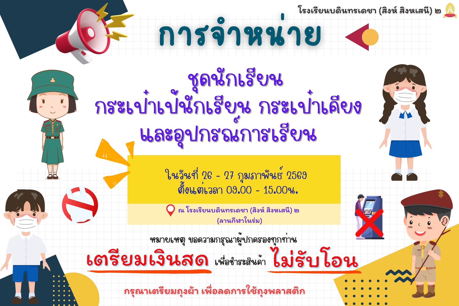 โรงเรียนบดินทรเดชา (สิงห์ สิงหเสนี) ๒ มีความประสงค์ จ้างเหมาบริการ ตำแหน่งนักพัฒนา จำนวณ 1 อัตรา อัตราค่าจ้างเดือนละ 12,000 บาท รายละเอียด<<คลิ๊ก