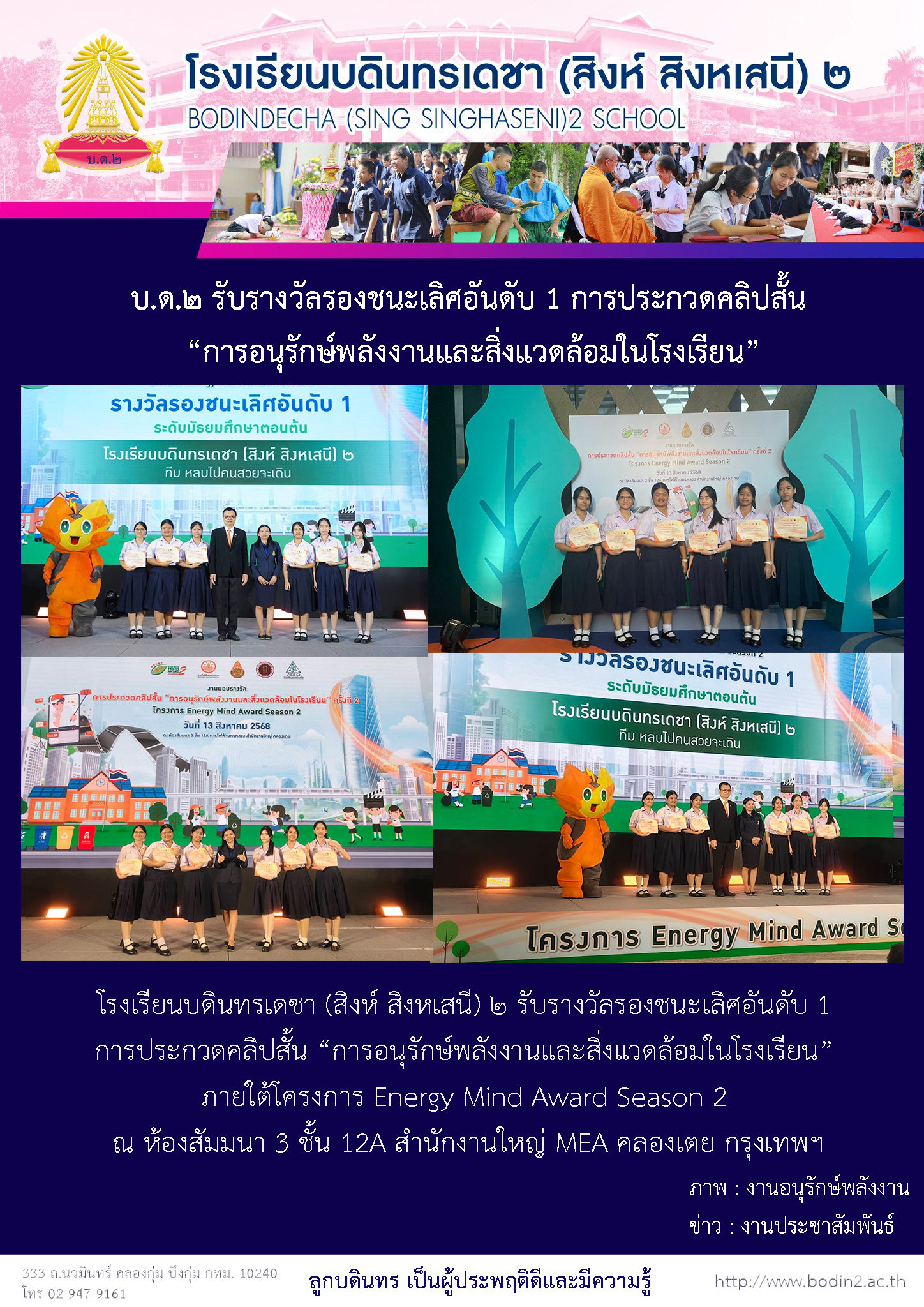 กิจกรรม/ข่าวสาร บ.ด.๒ รับรางวัลรองชนะเลิศอันดับ 1 การประกวดคลิปสั้น “การอนุรักษ์พลังงานและสิ่งแวดล้อมในโรงเรียน” 19 December 2025 admin Jerry