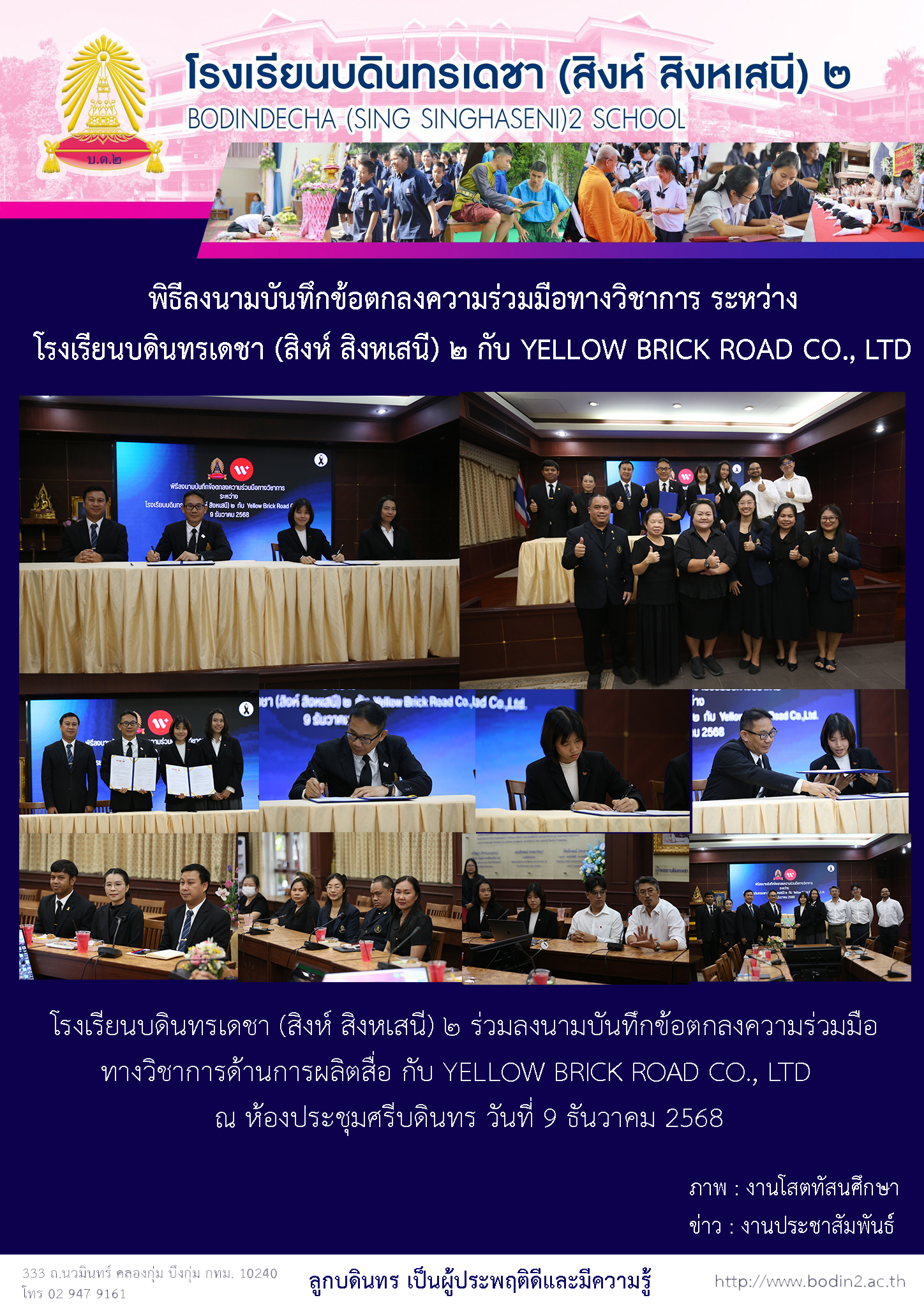 กิจกรรม/ข่าวสาร พิธีลงนามบันทึกข้อตกลงความร่วมมือทางวิชาการ ระหว่าง โรงเรียนบดินทรเดชา (สิงห์ สิงหเสนี) ๒ กับ YELLOW BRICK ROAD CO., LTD 19 December 2025 admin Jerry