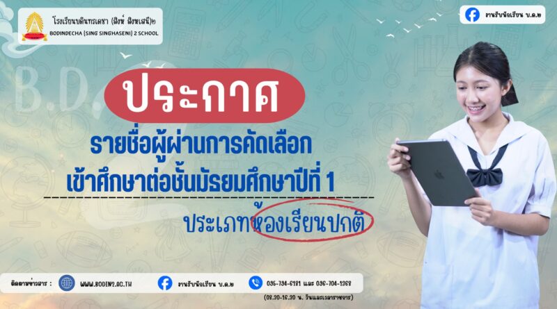 ประกาศรายชื่อนักเรียนที่สอบคัดเลือกได้เข้าเรียนชั้นมัธยมศึกษาปีที่ 1 ปีการศึกษา 2569 ประเภทห้องเรียนปกติ