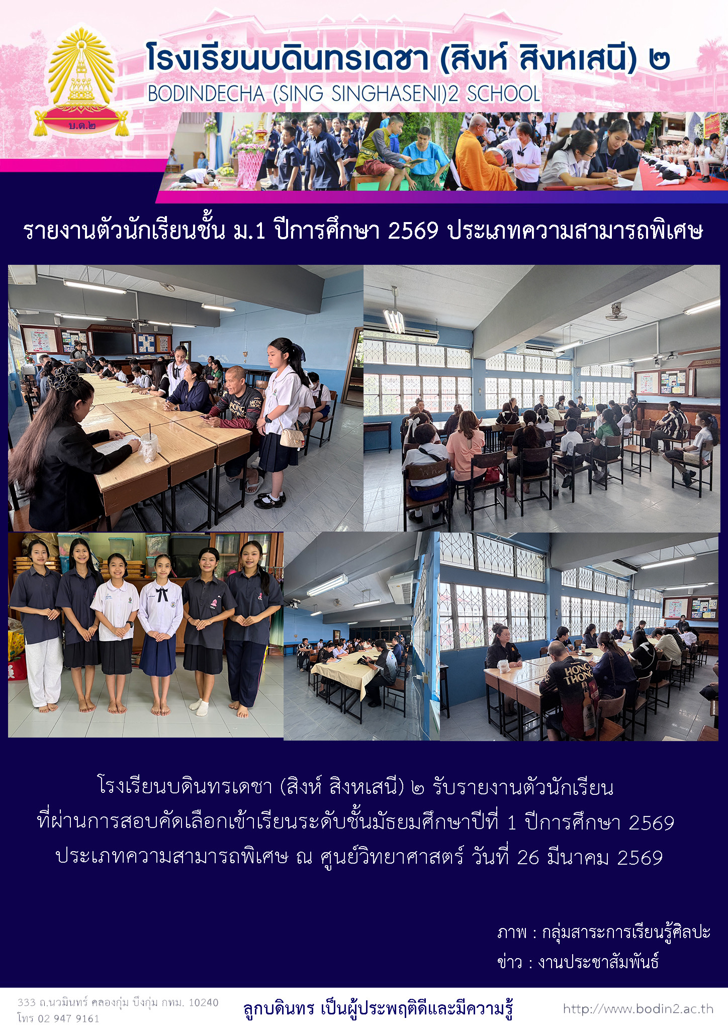 กิจกรรม/ข่าวสาร รายงานตัวนักเรียนชั้น ม.1 ปีการศึกษา 2569 ประเภทความสามารถพิเศษ 28 March 2026 admin Jerry