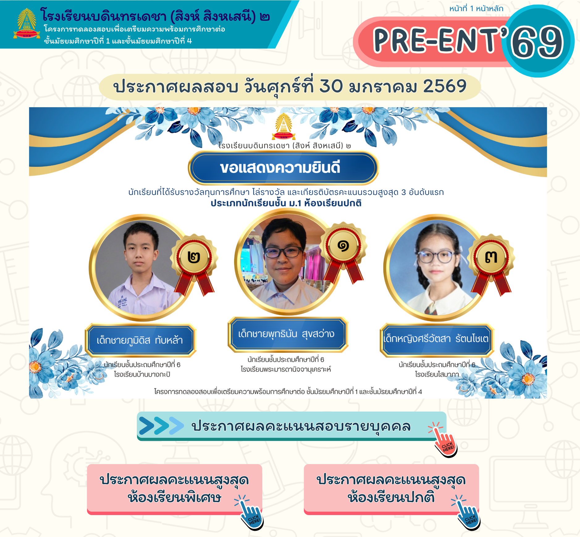 ประกาศรายชื่อนักเรียน ม.3(เดิม) เข้าศึกษาต่อระดับชั้น ม.4 ประเภทห้องเรียนพิเศษ และห้องเรียนปกติ<<คลิ๊ก
